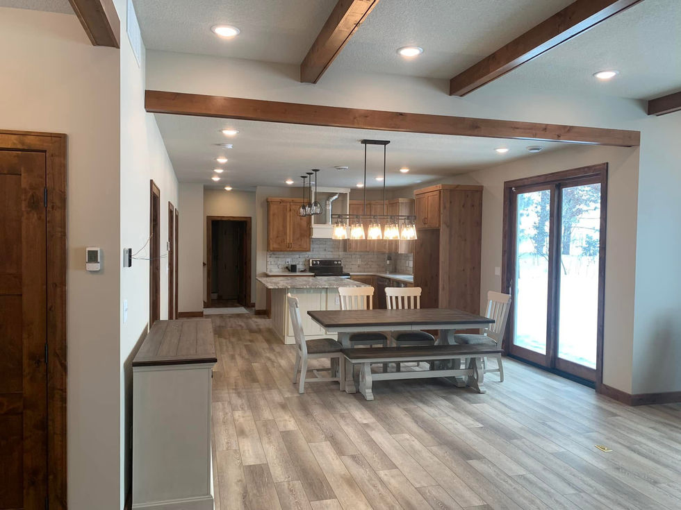 Step into the warmth and charm of these living spaces, where natural elements and modern design come together. From the bright living room with a stone fireplace to the open-concept kitchen and dining area with wooden beams, these spaces exude rustic elegance.